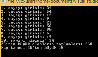 Console.ReadKey();Ödev 2: Klavyeden girilen 10 sayıdan 25 üstünde olanları toplamını ve kaç adet olduğunu bulup, ekrana yazdıran programı yapınız.