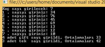 Console.WriteLine("{0} adet çift sayı girildi, Ortalamaları {1}",cift_sayisi,cift_toplam/cift_sayisi);