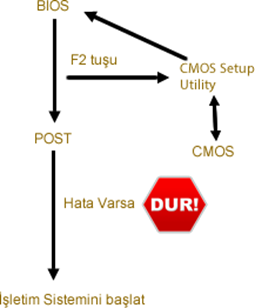 2. CPU, elektrik akımı tarafından uyarıldığında ROM’da yer alan BIOS yazılımını RAM (Ana Bellek) yükleyerek aktif hale getirir. BIOS programı; kendi içindeki kayıtlı bilgilerden, önce kendini ve POST programını kontrol eder, daha sonra System Bus (Bilgisayarın donanımlarını birbirine bağlayan devreler)’a sinyal göndererek devrelerinin görevlerini yapıp yapmadığını kontrol eder.