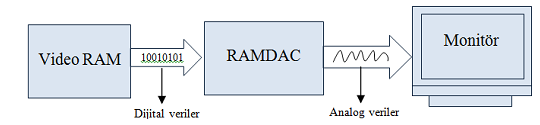 RAMDAC (dijital-analog çevirici): Ekran kartının görüntü belleğindeki dijital (sayısal) verileri monitörde görüntülenecek analog sinyallere dönüştürerek ekran kartının monitör çıkışına gönderir. RAMDAC’in verileri dönüştürme ve aktarma hızı, ekran tazelenme hızını belirler. Bu hız Hz cinsinden ölçülür. Örneğin monitörün ekran tazeleme hızı 70 Hz olarak ayarlanmışsa görüntü saniyede 70 defa yenilenir.
