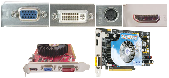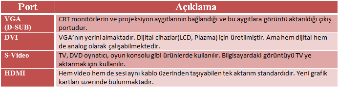 - Çıkışlar: Bilgisayardaki görüntüyü aktarmak istediğimiz ortama uygun kart çıkışlarının olması gerekmektedir. Günümüzde aşağıdaki çıkışlar vardır.